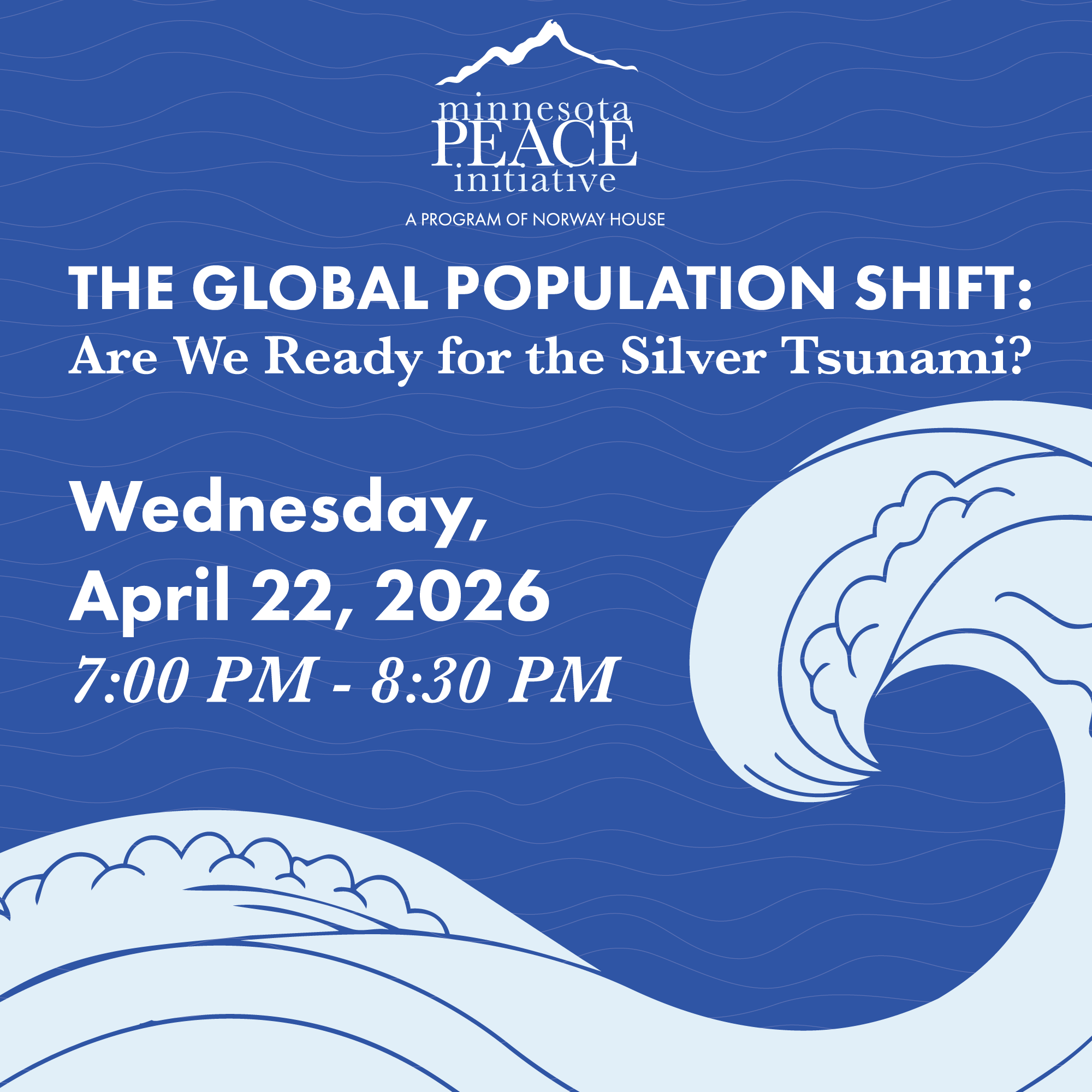 Populations around the world are aging at an unprecedented rate as birth rates decline and life expectancy rises, creating a profound demographic shift often called the “silver tsunami.” Join the next Minnesota Peace Initiative event to explore what this transformation could mean for economies, healthcare systems, workforce development, benefit programs and social stability—and whether our societies are prepared for the challenges and opportunities ahead.