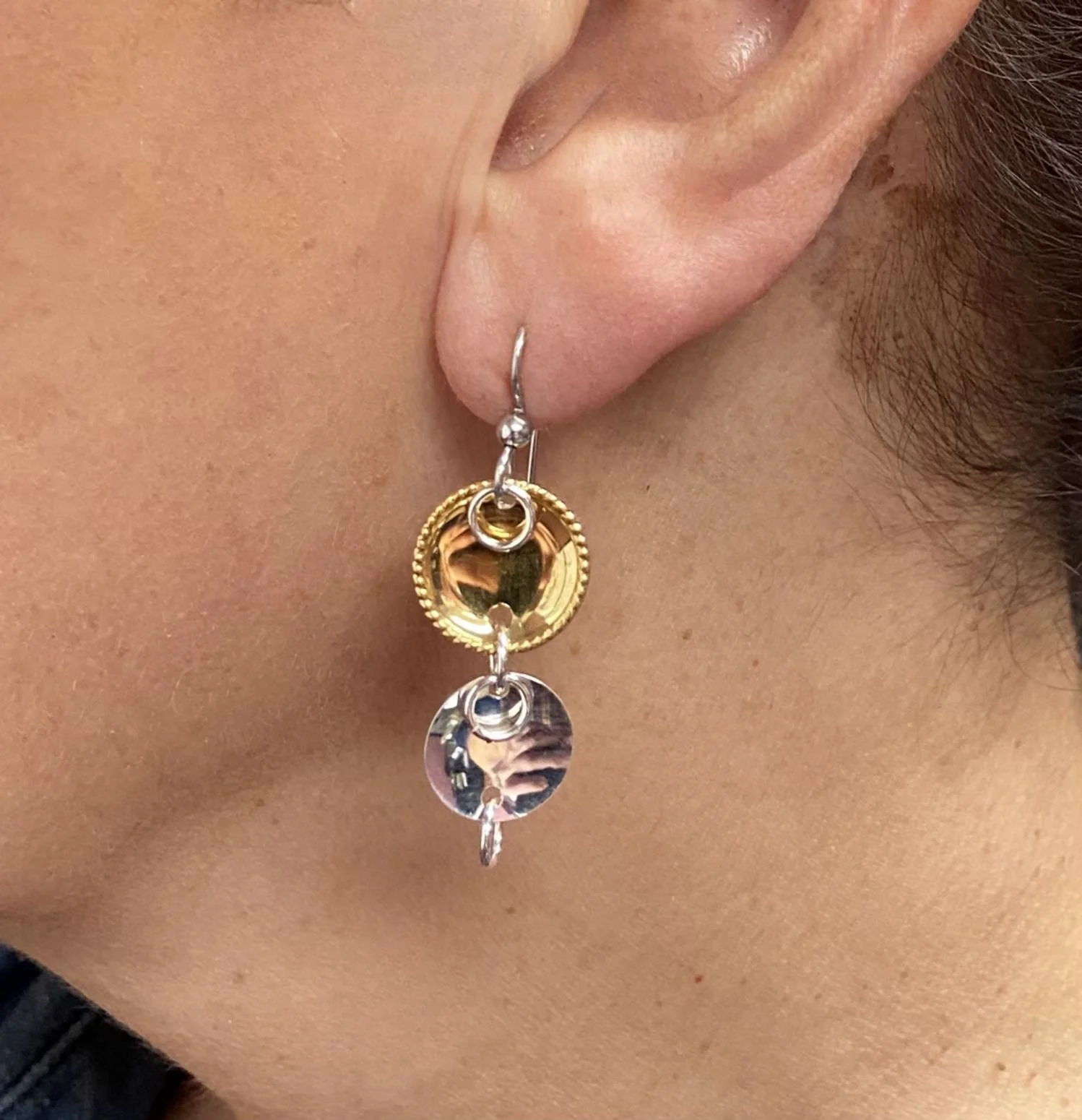 Ever wonder why sølje pins have those shiny dangles with silver disc drops? These discs are called “spoons” or “shells” in Norwegian. Silver has long been a protective element against evil and abduction by the hulder folk in Scandinavia. Legend has it that should you run into the devil wearing your sparkling sølje he would see his own reflection and run away! Don’t run away from a chance to create your own silver and gold washed earrings in this short class designed to introduce you to the beauty of Scandinavian silver work. Students will assemble up to 2 pairs of earrings using multiple disc elements suspended from sterling silver French hook ear wires. A willingness to use hand tools (pliers) is required.