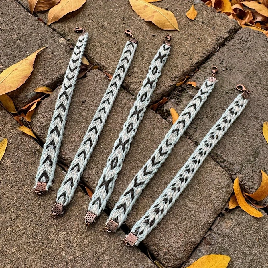 Participants will begin by learning how to warp their tablet weaving patterns and practice weaving a short band. Once they understand the basics and have worked out the muscle memory of weaving, they will weave a bracelet-length of band in their chosen pattern. At the end of the workshop, participants will complete their bracelets with copper findings. With these new skills, participants will be able to create woven bands for a variety of uses, including additional bracelets.