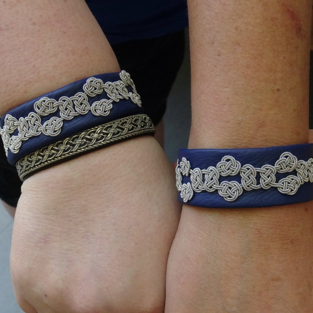 In this class students will practice the art of posament using nylon cords to perfect a “Josephine”and a triangular series of braided knots. We will then construct knots of different lengths using pewter coiled thread (96% tin + 4% silver) and sew the finished braid to a softened leather strip to create a bracelet. A pewter button finishes off the bracelet.